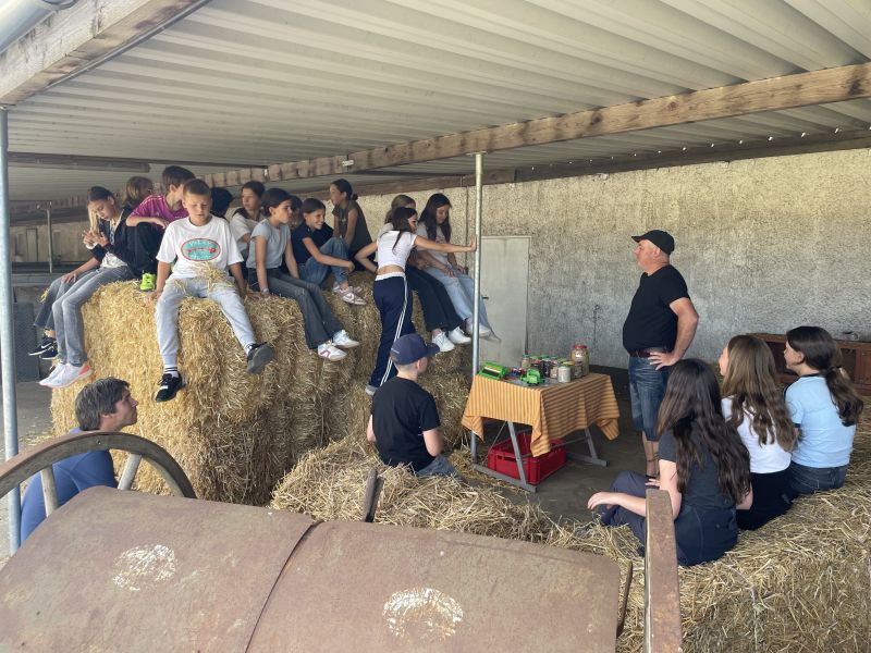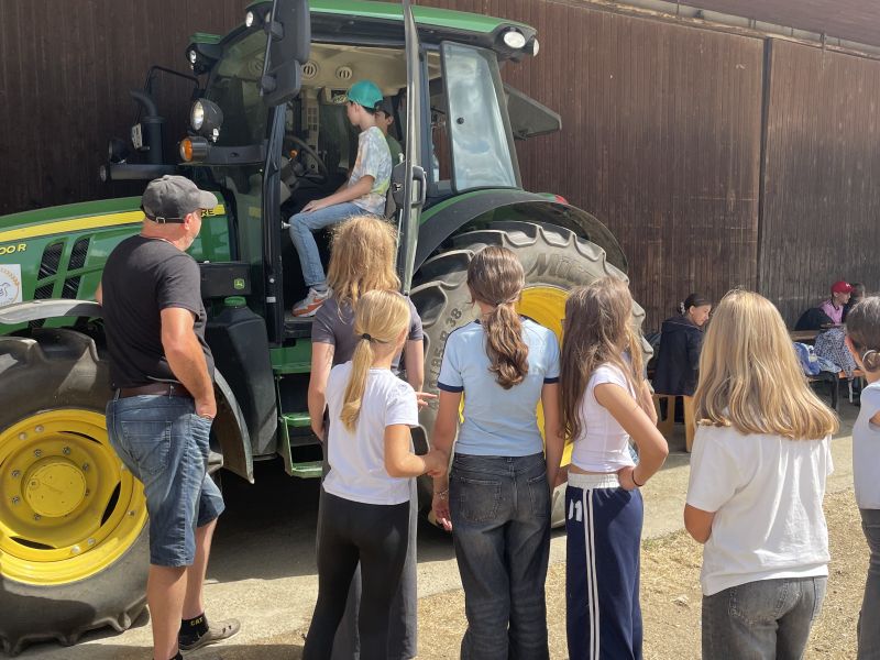 Herr Kuttenreich erklärte uns unter anderem, wie er sein eigenes Getreide anbaut und erntet. Dieses dient nämlich später nicht nur als Futter für die Tiere, sondern auch das dabei entstehende Stroh findet eine wichtige Verwendung, denn dieses bekommen die Schweine zum Spielen, damit sie ausgelastet sind und sich nicht gegenseitig ärgern – fast wie bei uns in der Schule, wenn alle genug zu tun haben!