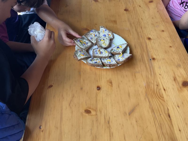 Nach vielen Eindrücken und spannenden Erzählungen gab es eine wohlverdiente Pause. Frau Kuttenreich überraschte uns mit selbstgemachter Limonade und leckeren Blütenbroten und Herr Kuttenreich zeigte uns währenddessen seinen großen Traktor, auf dem viele sogar „Probesitzen“ durften.