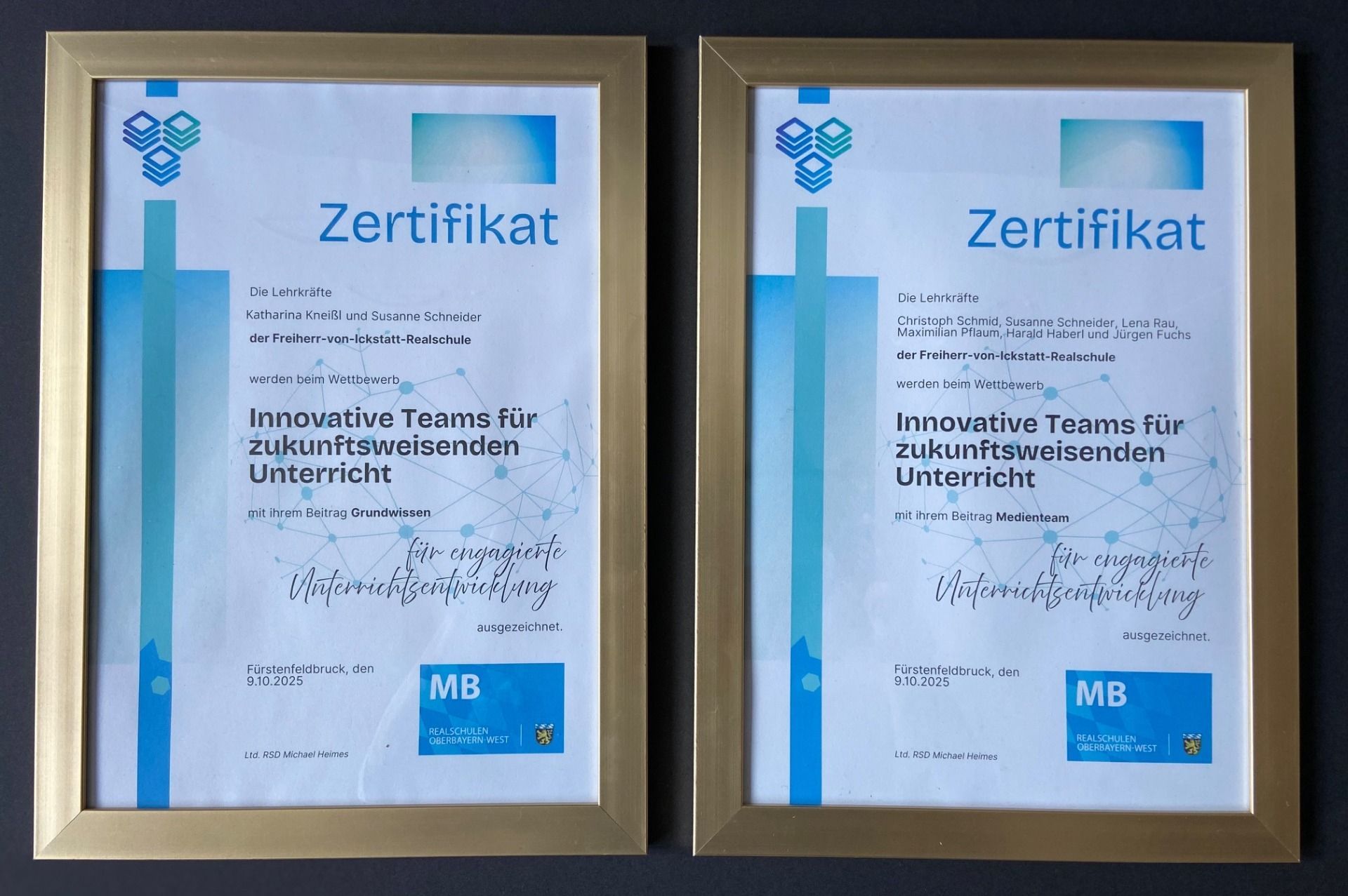 Gleich vier Urkunden durfte die Ickstatt für die überaus erfolgreiche und zukunftsweisende Schulentwicklung entgegennehmen. Neben der Auszeichnung für die beiden Teams, die eine besondere Methode anwenden, das Grundwissen zu vertiefen und die sich grundsätzlich mit unserer Medienbildung befassen, erhielten die Projekte „VR-Brillen im Unterricht“ und „Digitales Forschertagebuch“ sogar Auszeichnungen mit Goldmedaillen - umso bemerkenswerter, weil damit die beiden ersten Plätze an die Ickstatt gingen.