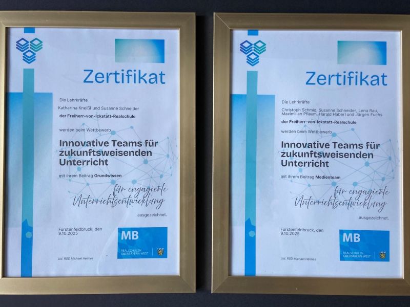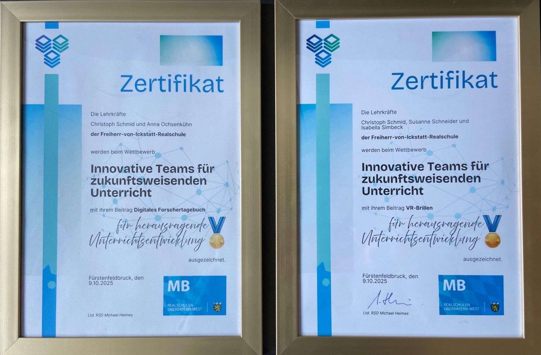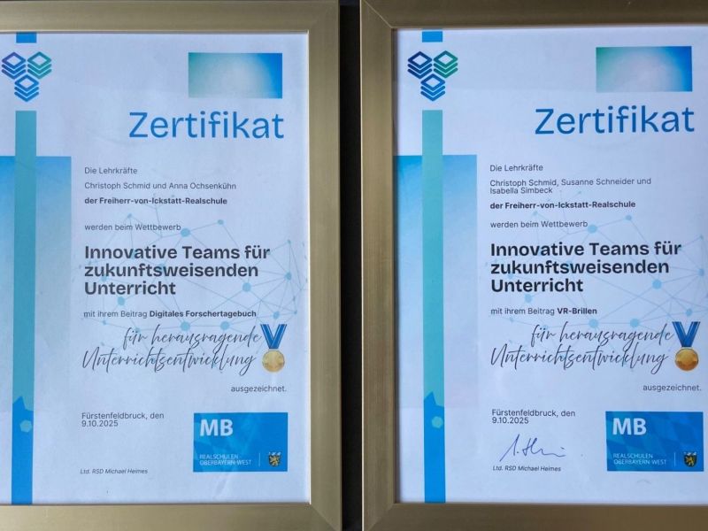 Gleich vier Urkunden durfte die Ickstatt für die überaus erfolgreiche und zukunftsweisende Schulentwicklung entgegennehmen. Neben der Auszeichnung für die beiden Teams, die eine besondere Methode anwenden, das Grundwissen zu vertiefen und die sich grundsätzlich mit unserer Medienbildung befassen, erhielten die Projekte „VR-Brillen im Unterricht“ und „Digitales Forschertagebuch“ sogar Auszeichnungen mit Goldmedaillen - umso bemerkenswerter, weil damit die beiden ersten Plätze an die Ickstatt gingen.